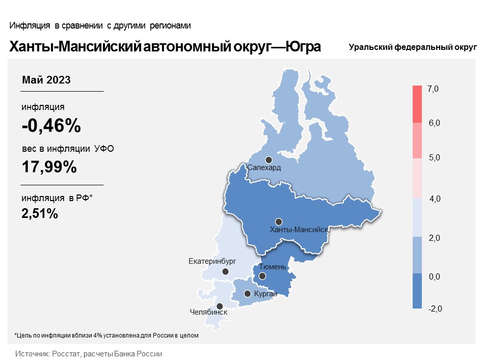 Согласно последнему информационно-аналитическому комментарию Банка России об инфляции, общий уровень цен в Югре в мае 2023 года был на 0,46 % ниже, чем годом ранее. При этом по Уральскому федеральному округу и стране в целом наблюдался рост цен на 1,47 и 2,51 % соответственно.