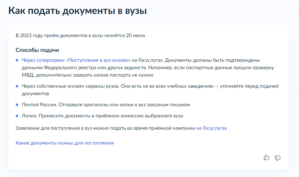 Документы можно сдать несколькими способами: лично, отправить заявление и копии оригиналов через операторов почтовой связи или предоставить их в электронном виде. Также поступающие на бакалавриат вот уже третий год могут подать заявление через портал Госуслуг (начнет работать с 20 июня).