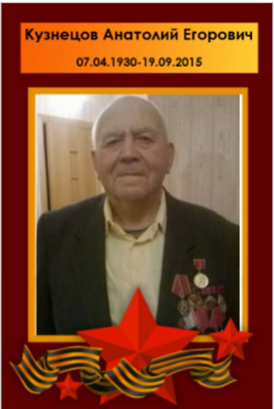 Мой прадедушка был тружеником тыла. Его зовут Кузнецов Анатолий Егорович. Он пошел работать в 12 лет, потому что его отца, Егора Ефимовича, забрали на войну. После победы над фашистами Егор Ефимович вернулся живой, но у него было много ранений, поэтому вскоре его не стало.