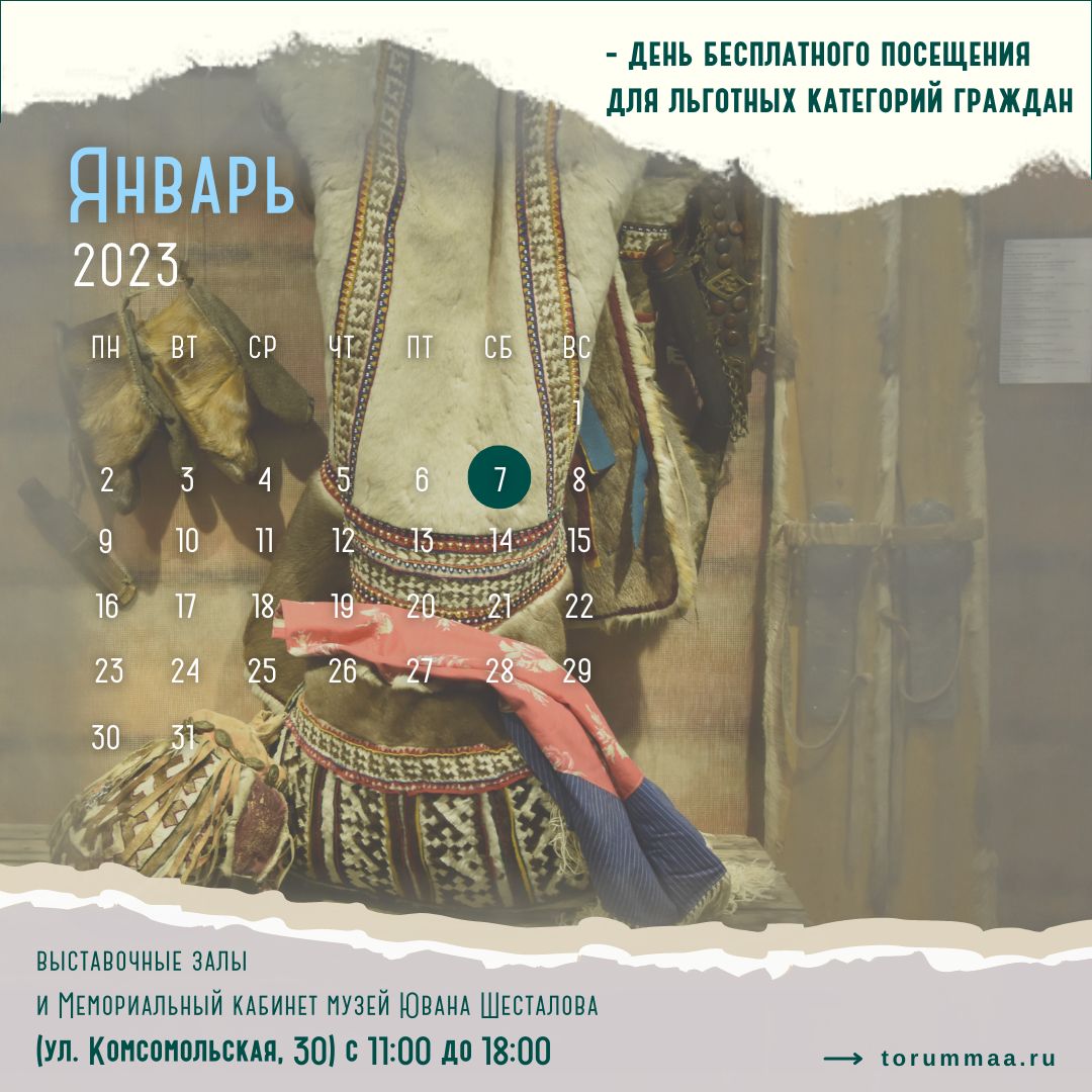 07 января 2023 года – выставочные залы и Мемориальный кабинет-музей Ювана Шесталова по адресу: ул. Комсомольская, 30, с 11:00 до 18:00.