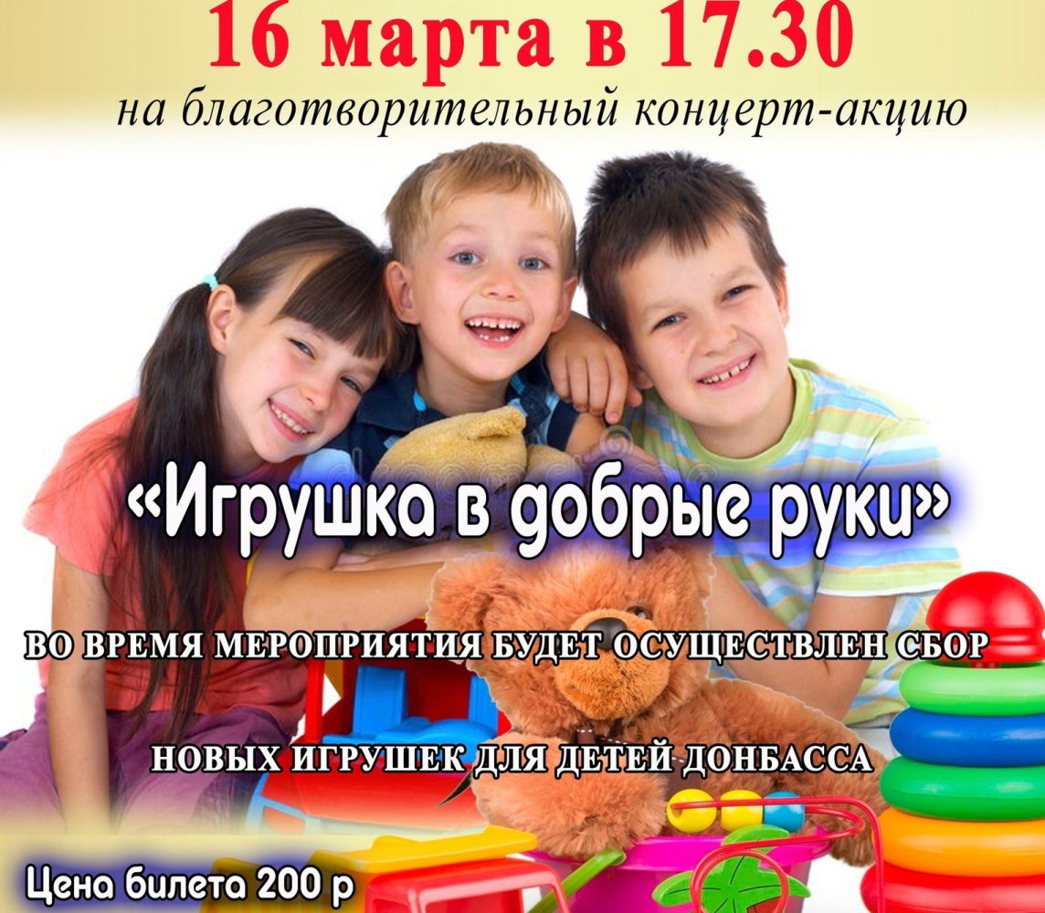 В Пыть-Яхе 16 марта в 17:30 в местном культурно-досуговом комплексе «Россия», расположенном в микрорайоне № 2а, состоится благотворительная акция-концерт по сбору игрушек для детей Донбасса.
