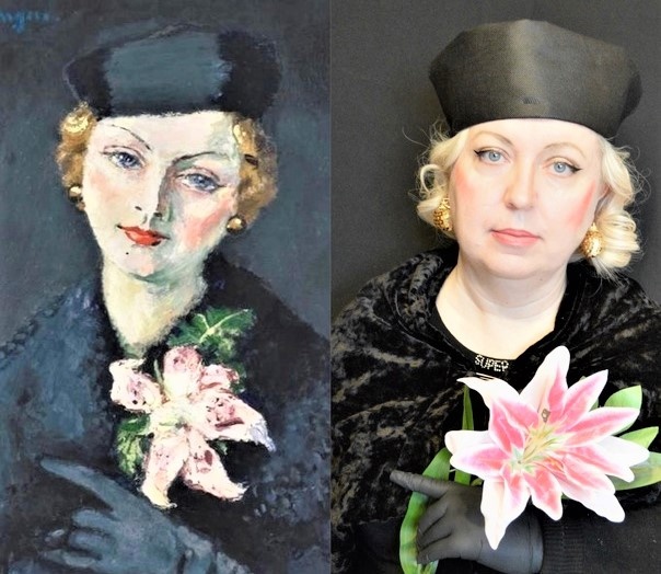 Ирина Порунова добивается необыкновенного преображения с помощью грима, костюмов и декораций. К примеру, для повторения «Женщины с орхидеей» понадобились: шляпка из тканевого пакета, серьги из ёлочных игрушек, орхидея, сконструированная из двух цветов искусственных лилий, чёрная перчатка, оставшаяся с ковидных времён, косметика. Для «Портрета женщины» Матисса детали костюмов сделали из бумаги и раскрасили акриловыми красками, шляпку дополнили искусственными цветами… Одним словом, дома у Поруновых настоящая творческая мастерская.
