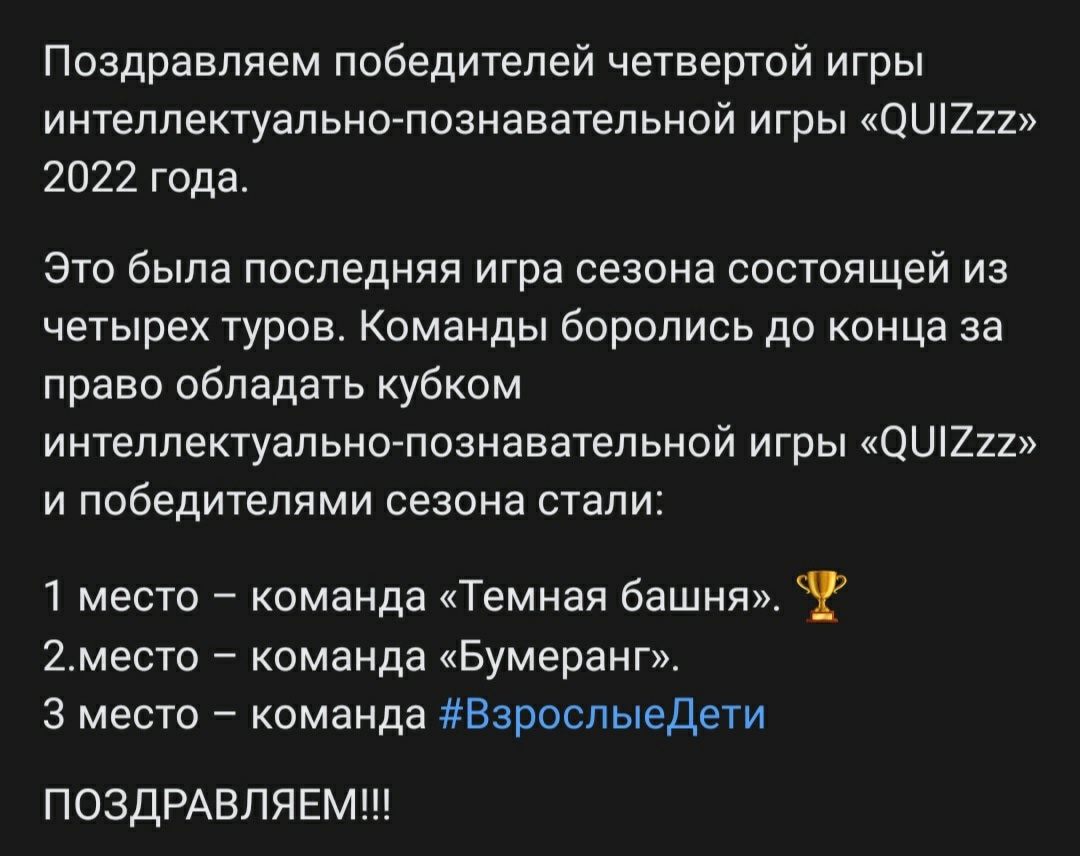 Команда Междуреченского агропромышленного колледжа #ВзрослыеДети заняли 3е место в игре сезона QUIZzz, состоящей из 4х туров.