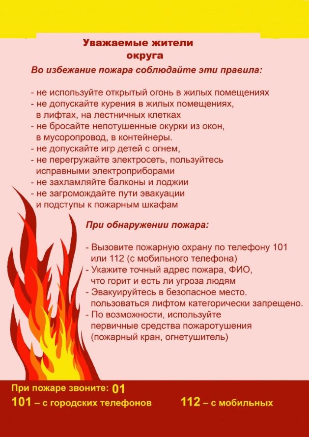 не выжигайте траву и стерню на полях; не жгите мусор вблизи строений; не разрешайте детям баловаться со спичками; во избежание перехода огня с одного строения на другое, очистите от мусора и сухой травы территорию хозяйственных дворов, гаражных кооперативов; не бросайте горящие спички и окурки; не оставляйте в местах отдыха непотушенные костры, спички, окурки, стеклянные бутылки (на солнце они работают как увеличительные стекла, фокусируют солнечный свет и поджигают траву, мох и т.д.); не разводите костров на торфяниках, под деревьями, у пней, в местах скопления мусора.В случае возникновения пожара необходимо незамедлительно сообщить об этом по телефону «01» или «112» (при этом необходимо назвать адрес объекта, место возникновения пожара, а также сообщить свою фамилию).