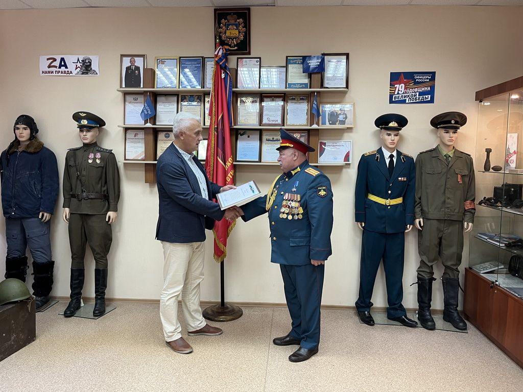 Игорь Бруслиновский вручил Благодарственное письмо Александру Сусидко со словами признательности: «Не первый раз в музее у Александра Ивановича. Вижу с какой заботой и трепетом здесь относятся к каждому экспонату, а сейчас еще и к сохранению памяти об участниках СВО.