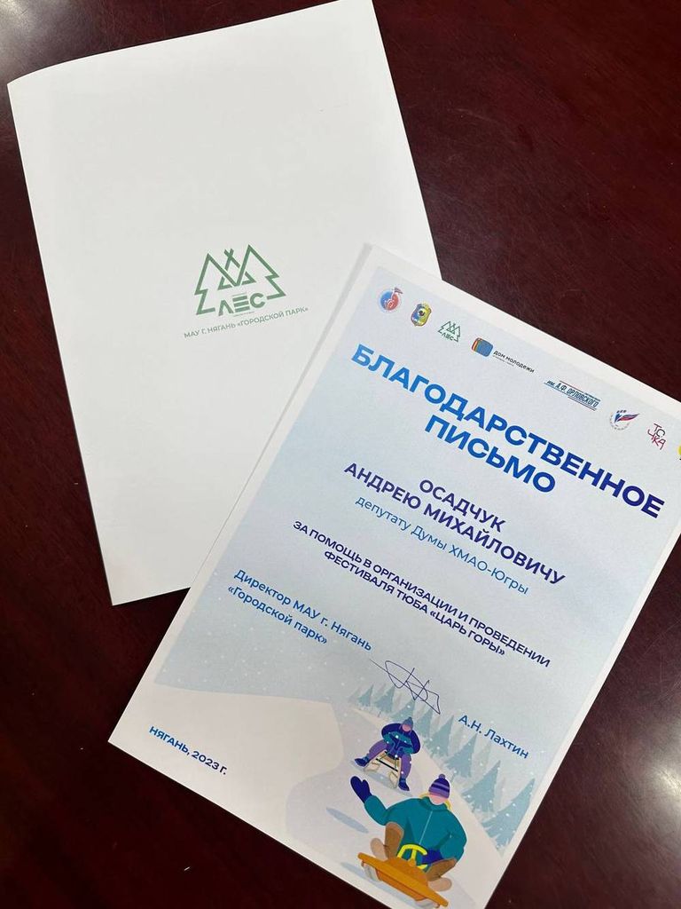 Руководство муниципального автономного учреждения Нягани «Городской парк» выразило благодарность в социальных сетях, а также направило официальное письмо на имя депутата Думы Югры Андрея Осадчука. Парламентария поблагодарили за помощь в организации и проведении фестиваля тюба «Царь горы» в городе Нягани.