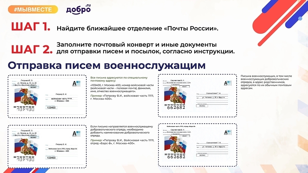 При оформлении посылки в адресных строках необходимо указать фамилию, имя и отчество адресата, номер войсковой части, индекс 103400 и адрес — г. Москва, 103400.