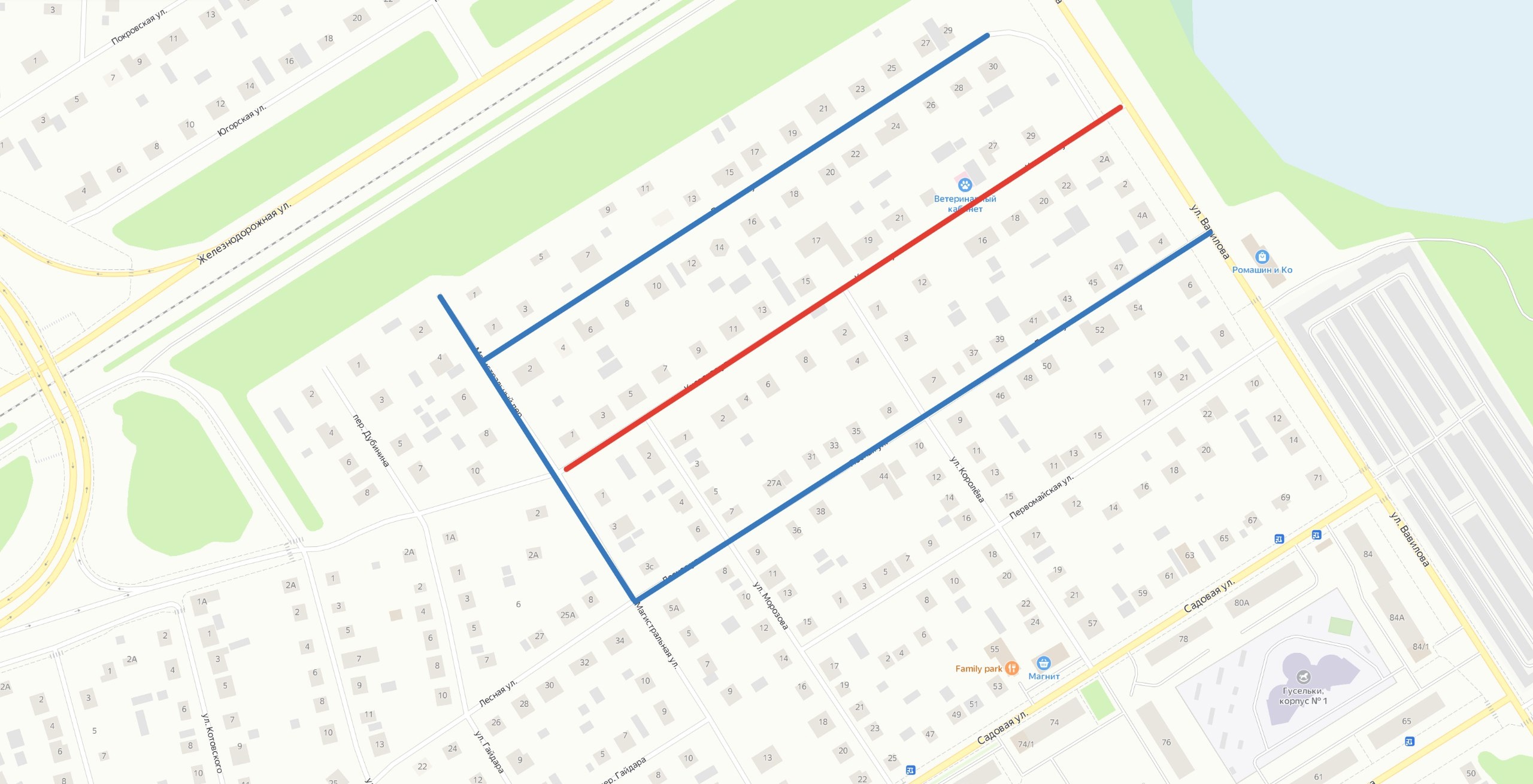 Просим югорчан обратить внимание на схемы перекрытия улиц . Красным выделен участок реконструкции, синим вариант объезда.