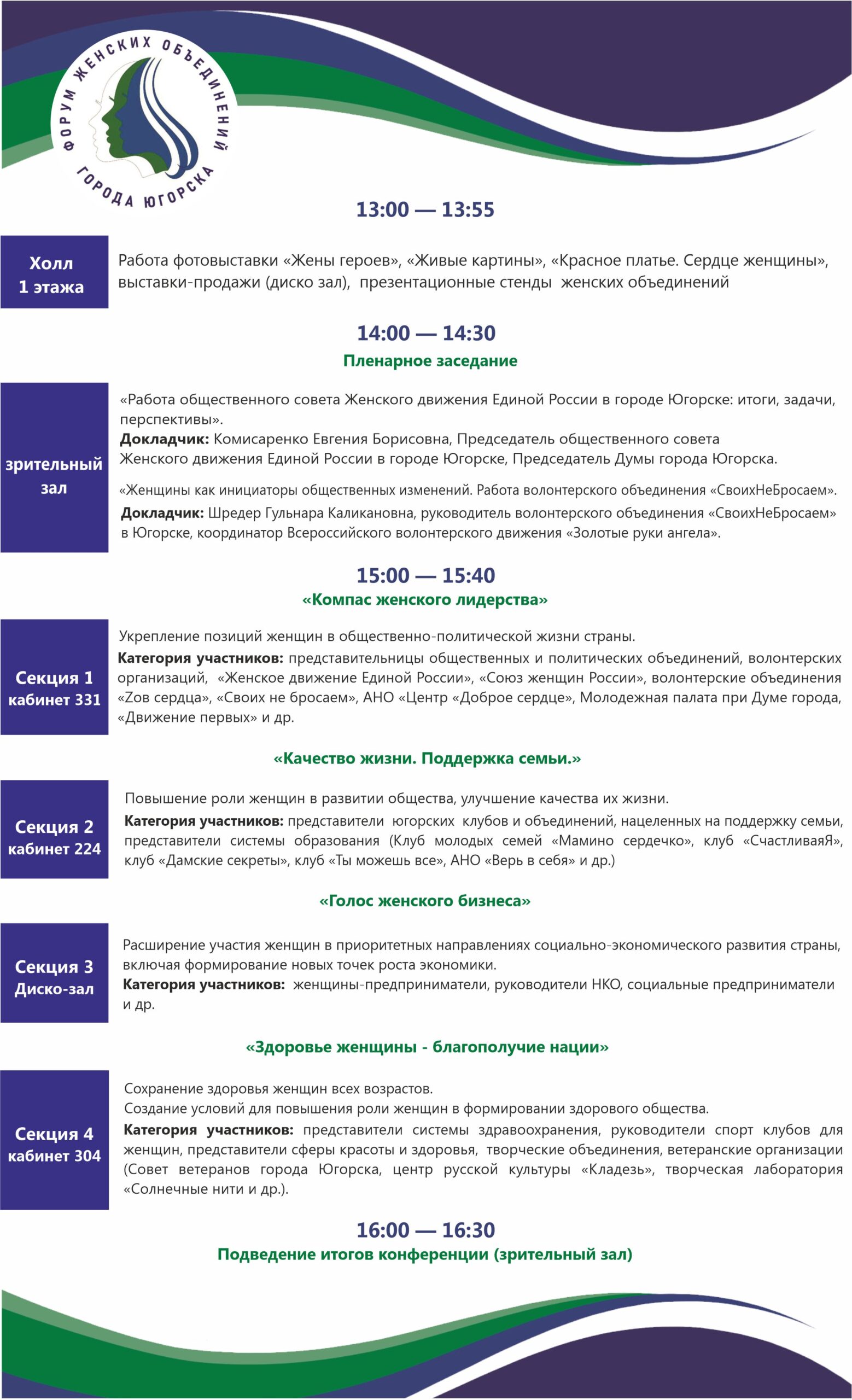 Пленарное заседание Тематические секции Презентация женских объединений города Югорска Предоставление участникам возможностей презентации проектов и поиска партнеров для их реализации Расширение и укрепление муниципального сотрудничества Налаживание и координация связей Обсуждение актуальных социальных, культурных и экономических проблем, волнующих женское сообщество Живой диалог женщин–практиков Развитие интеграционных процессов, для обмена опытом и реализации совместных проектов Новые контакты и полезные знакомстваПрограмма Форума: