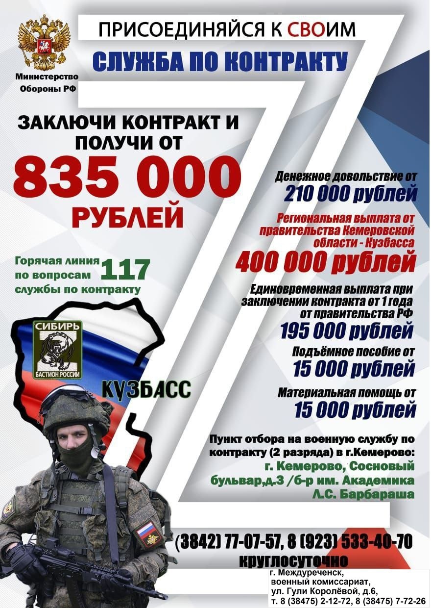 Федеральная выплата от правительства РФ при заключении контракта от 1 года 195 000 рублей.