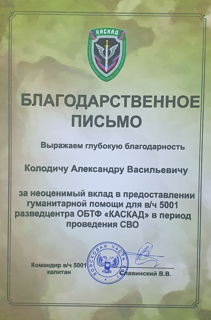 В письме говорится: «Выражаем глубокую благодарность Александру Колодичу за неоценимый вклад в предоставлении гуманитарной помощи для воинской части № 5001 разведцентра ОБТФ «Каскад» в период проведения СВО».