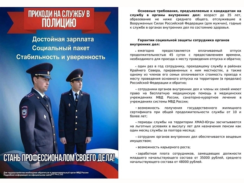 Требования: предельный возраст поступления на службу в органы внутренних дел - 35 лет, высшее юридическое образование;