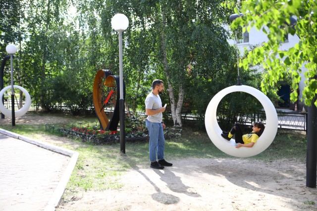 В сквере расположились несколько инсталляций. Пожалуй, главный из них – дерево любви. Планируется, что оно возьмет на себя не только декоративную функцию, но и укрепит намерения молодоженов жить долго и счастливо. На композиции пары смогут завязывать ленточки в память о своем дне бракосочетания. Также в сквере появились две качели в форме колец и 11 лавочек.