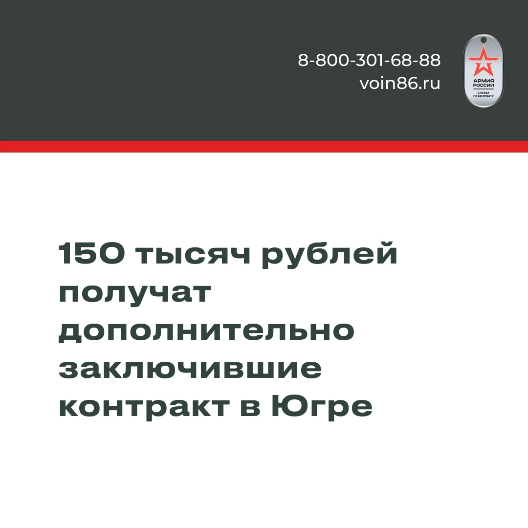Помимо этой суммы военнослужащие получат 195 тысяч рублей от Минобороны РФ. Каждому, кто заключит контракт в Югре, выплатят дополнительно 500 тысяч рублей. Вся актуальная информация о мерах поддержки для контрактников – по телефонам 8 800 301-68-88, 117 и на сайте voin86.ru. Встанем плечом к плечу за Родину!