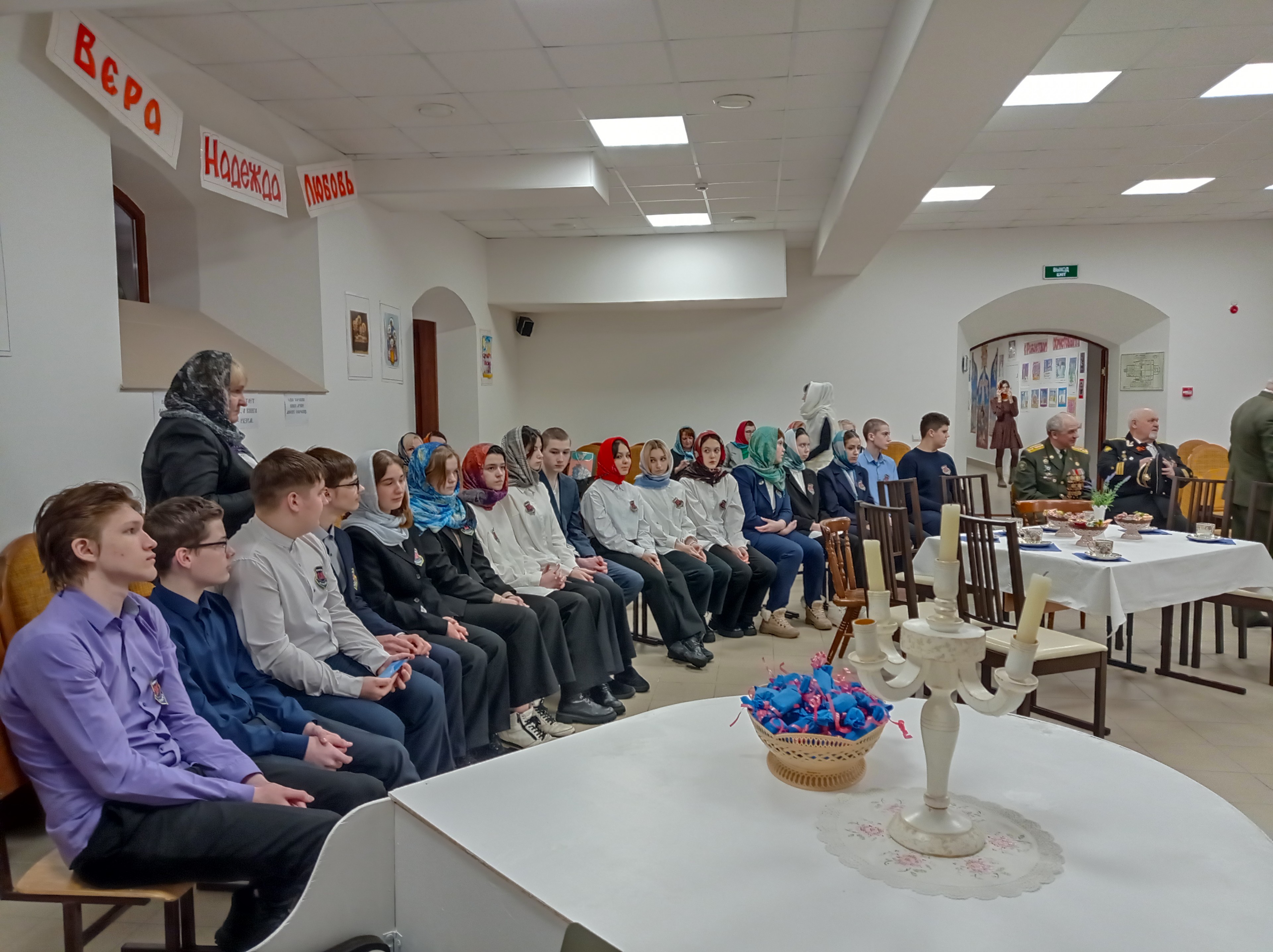 В рамках проведения ежемесячных онлайн встреч учащихся средних образовательных школ России с героями России, героями Труда, а также матерями-героинями и военнослужащими, участниками СВО, награжденными государственными наградами за мужество и доблесть, по благословению настоятеля протоиерея Николая Силина, в актовом зале храма святых мучениц Веры, Надежды, Любови и матери их Софии прихода храма в честь иконы Божией Матери «Всех скорбящих Радость» состоялась онлайн встреча с матерями-героинями.