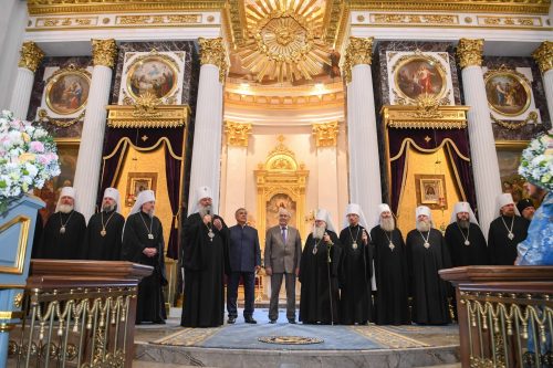 После богослужения состоялось общение Раиса РТ Рустама Минниханова и Государственного советника РТ Минтимера Шаймиева с прибывшими в Казань на празднования архипастырями.