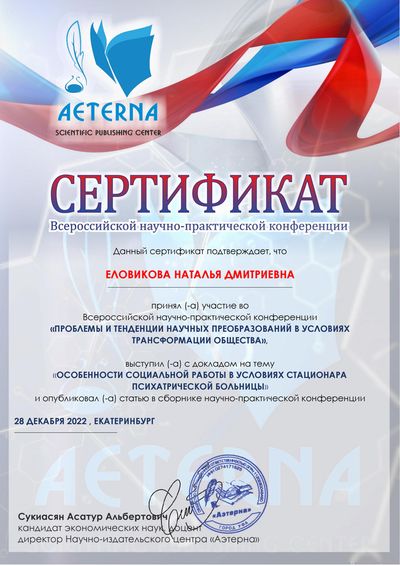 Специалист по социальной работе психиатрического отделения для принудительного лечения специализированного типа БУ «Советская психоневрологическая больница» Еловикова Наталья Дмитриевна приняла участие во Всероссийской научно-практической конференции «Проблемы и тенденции научных преобразований в условиях трансформации общества".