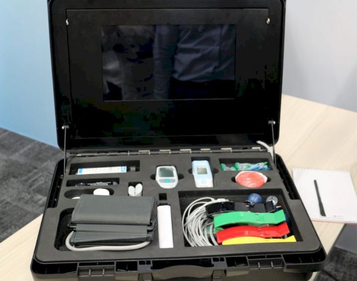 «Цифровой ФАП» — это диагностическое оборудование, собранное в компактный кейс для безопасной транспортировки и хранения, с подключением к интернету и ИИ-сервисам. Комплекс включает электрокардиограф, тонометр, анализатор крови и мочи, термометр, пульсоксиметр. С помощью аппаратно-программного комплекса можно получить результаты лабораторных и инструментальных исследований в режиме реального времени, провести обследование маломобильных пациентов на дому, плановые и экстренные телеконсультации с профильными специалистами областных больниц региона.