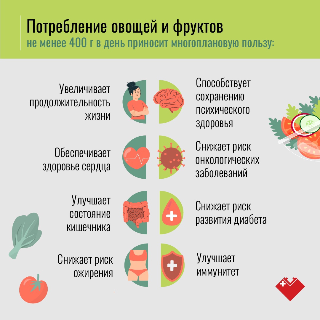 Согласно последним рекомендациям ВОЗ, необходимо потреблять не менее 400 гр. овощей и фруктов в день.