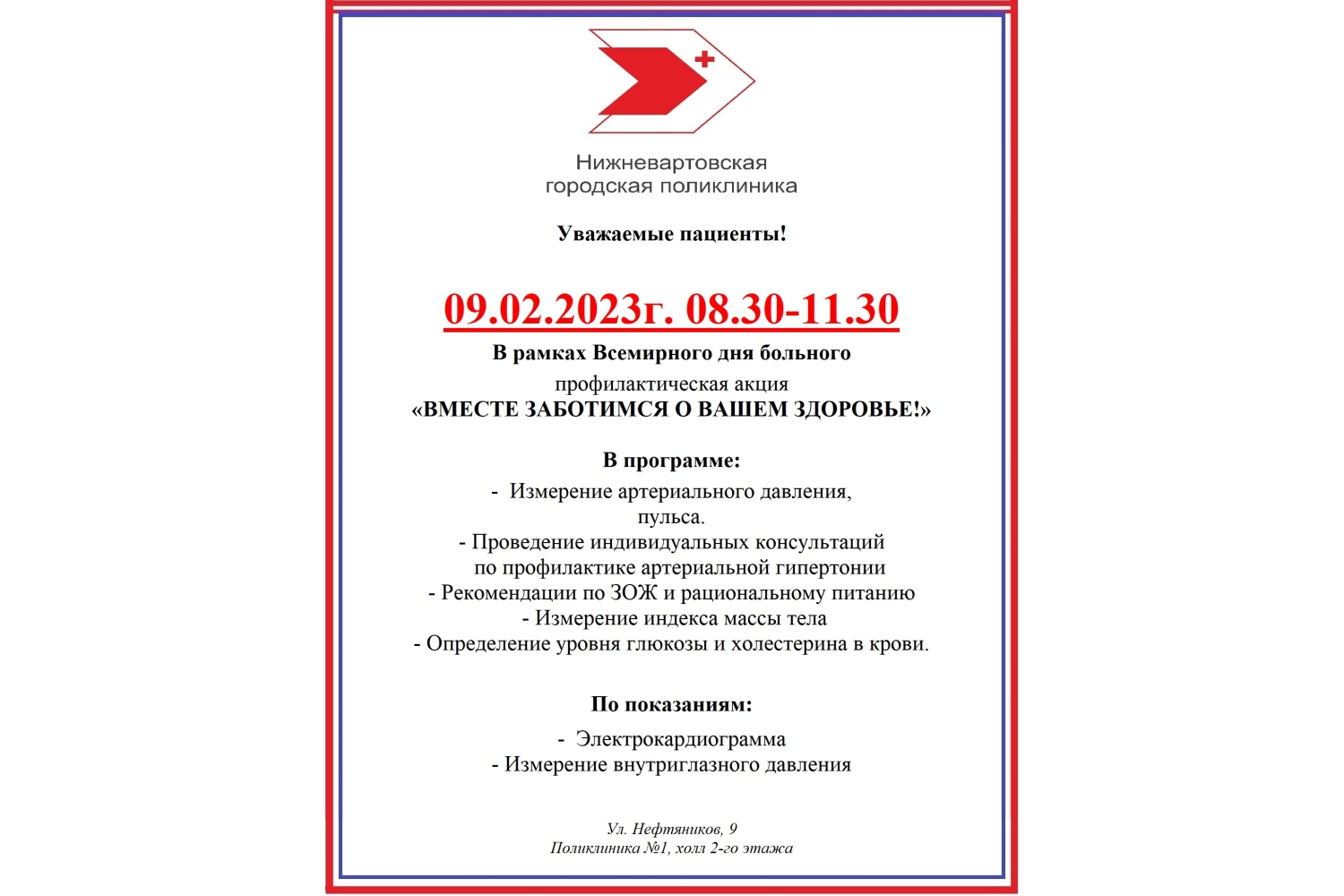 Приглашаем вас пройти обследование в ходе профилактической акции, посвященной Всемирному дню больного. В холле 2 этажа поликлиники №1 пройдут мероприятия в рамках ежегодной акции «Вместе заботимся о Вашем здоровье!».