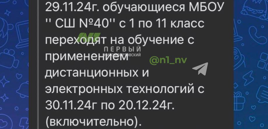 Согласно информации, предоставленной родителям, с 29 ноября 2024 года обучающиеся МБОУ СШ №40 с 1 по 11 класс переходят на обучение с применением дистанционных и электронных технологий.
