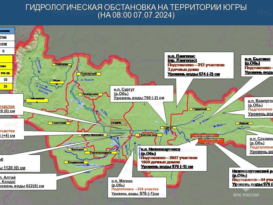 По информации Ханты-Мансийского центра по гидрометеорологии и мониторингу окружающей среды – филиала «Обь-Иртышское управление по гидрометеорологии и мониторингу окружающей среды», сегодня, 7 июля, уровень воды в реке Оби составляет 976 сантиметров (минус 1 сантиметр за минувшие сутки).