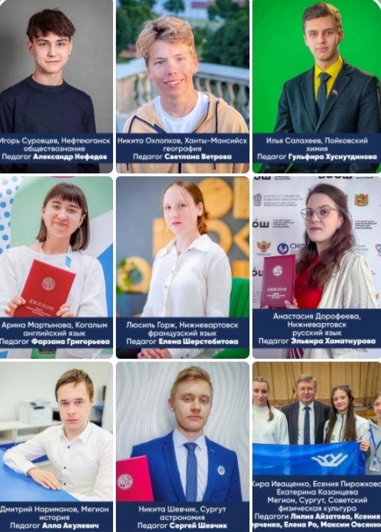 «Подготовиться им помогли наши югорские преподаватели . Это Игорь Суровцев и педагог Александр Нефедов из Нефтеюганска, Никита Охлопков и педагог Светлана Ветрова из Ханты-Мансийска, Илья Салахеев и педагог Гульфира Хуснутдинова из Пойковского, Арина Мартынова и педагог Фарзана Григорьева из Когалыма, Люсиль Горж и педагог Елена Шерстобитова, Анастасия Дорофеева и педагог Эльвира Хаматнурова из Нижневартовска, Дмитрий Нариманов и педагог Алла Акулевич, Кира Иващенко и педагог Ксения Оверченко из Мегиона, Никита Шевчик, его педагог и по совместительству папа, пилот-инструктор Сергей Шевчик, Есения Пирожкова и педагог Лилия Айзатова из Сургута, Екатерина Казанцева и педагоги Елена Ро, Максим Овсянников из Советского», — отметила Наталья Комарова.