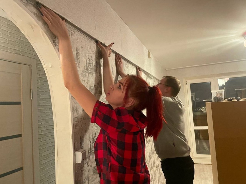 За две недели в квартире семьи военнослужащего обновили зал, кухню и прихожую: поклеили обои, положили линолеум, установили потолочную плитку и собрали мебель.