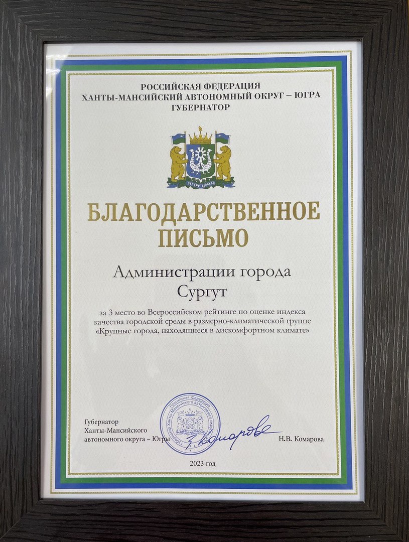Сургут отмечен Благодарственным письмом Губернатора Югры за 3 место во Всероссийском рейтинге индекса качества городской среды